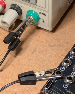 - Plug an audio signal (from one of the SineSquare oscillators, say) into Audio Input 1, and move the switch to the up position to turn on the radio signal.